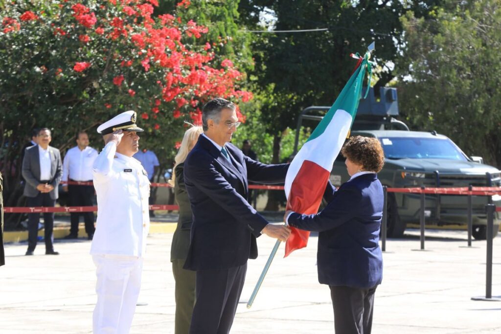 Tras abanderar a las escoltas de cinco escuelas primarias, Américo Villarreal recordó́ que la bandera fue estandarte de identidad de los insurgentes y recoge el tributo necesario a nuestros pueblos originarios.